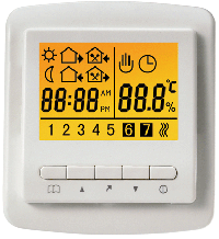 Deze thermostaat is voorzien van vele instelmogelijkheden waarbij er een keuze kan worden gemaakt in het menu tussen vloer- en/of ruimtesensor. Ook kan er worden bekeken hoe lang de verwarming heeft aangestaan (in %). Deze thermostaat heeft 6 schakelmogelijkheden per dag en kan worden ingesteld op automatische bediening (klokfunctie) of handbediening. Door de grote verlichte display zijn de gegevens goed af te lezen. De functie toetsen zijn onder de display gepositioneerd.