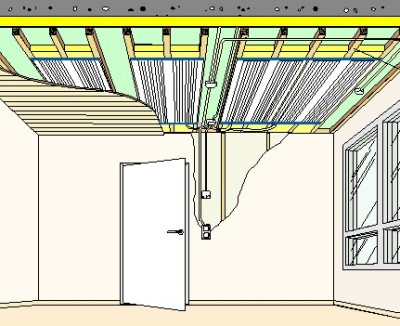 De 2HEAT-plafondverwarming wordt uit het zicht gemonteerd. De folieverwarming wordt gemonteerd boven de plafondplaten, tussen afstandhouders die op het plafond worden gemonteerd (zie afbeelding)
