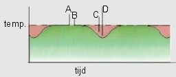 A: CV-Ketel (aanvoer warm water) AAN B: Pomp AAN C: CV-ketel (aanvoer warm water) UIT D: Pomp UIT |