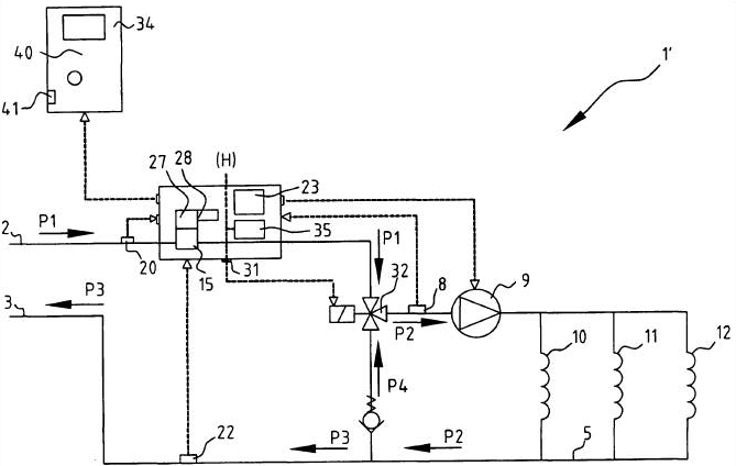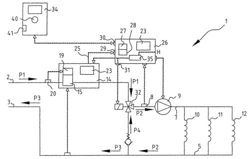 regelklep alsmede een circulatiepomp met instelbaar pompdebiet, waarbij het pompdebiet afhankelijk van het door