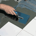 Wanneer de mat met kabel zich heeft gehecht aan de ondergrond wordt een tweede laag flexibele lijm aangebracht.