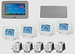Deze WIFI internet temperatuurregeling, biedt de mogelijkheid om de temperatuur in 8 zones (bestaande uit één of meerdere ruimtes) onafhankelijk van elkaar te kunnen regelen, met behulp van een full colour touchscreen controller, RF thermostaat, pc, tablet, smartphone, i-pad, i-phone, android, blackberry etc etc.
