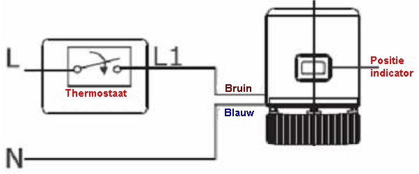 Elke 2HEAT thermostaat kan worden toegepast om de klep te kunnen activeren. Hieronder worden de aansluiting weergegeven vanaf de