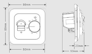 - Regeling van vloer- en ruimtetemperatuur: met de draaiknop regelt men de ruimtetemperatuur. De inwendige draaiknop staat standaard op 30°C, en kan worden ingesteld op een temperatuur tussen de 25°C en 50°C. Deze fungeert als vloertemperatuurbegrenzer.